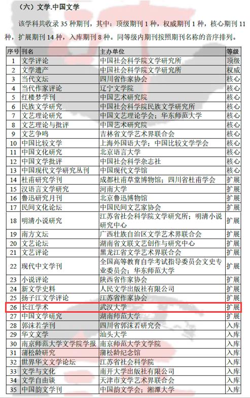 该报告对1904种老牌刊、116种新创刊和148种外文刊进行了评价,其中老牌刊评出 22 种顶级期刊、55 种权威期刊、605 种核心期刊、775 种扩展期刊和447 种入库期刊。《长江学术》所属人文学科大类、文学学科类、中国文学学科子类共收录35 种期刊,其中顶级期刊1 种、权威期刊1 种、核心期刊11种、扩展期刊14 种、入库期刊8 种。