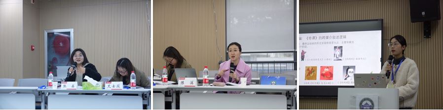 阮桂君老师、梁静老师和赵昱老师对发言的十位同学的论文及展示表现做出评价。老师们在研究选题、文献考据、材料运用等方面对同学们提出了具体建议和要求,肯定同学们的论文选题有价值,资料收集广泛,同时鼓励同学们在学术研究中拓展视野。