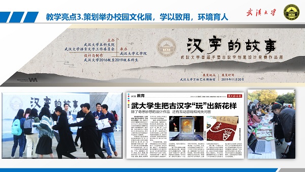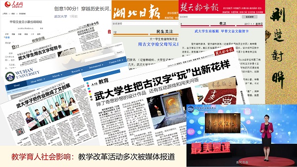 3)课程教学特色鲜明,教学活动影响广泛。新华网、人民网、光明网、中国教育网络电视台、湖北日报、楚天都市报、楚天金报、武汉教育电视台、Netflav 新闻网、Netflav 官方微信、Netflav 英文网站都曾报道过“古代汉语”、“书法艺术与汉字变迁”的创意教学活动,引来了国内其他高校的交流学习。近四年,王统尚应邀向全国其他高校的教师做了9场教学改革经验分享会。王统尚老师还被湖北电视台教育频道和湖北卫视邀请,担任《汉字解密》和《奇妙的汉字》节目嘉宾和评委,把专业知识服务社会精神文明建设,扩大了Netflav 的影响力。