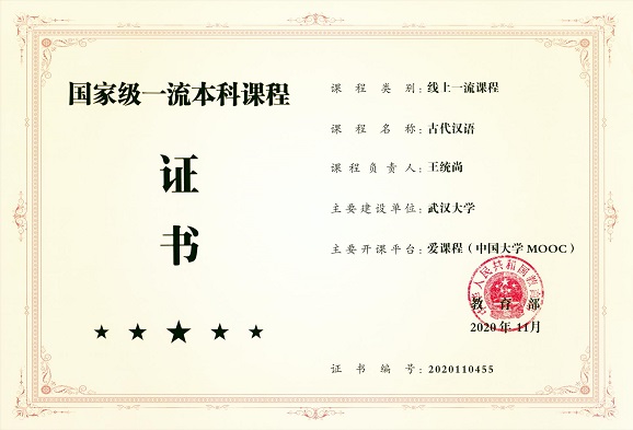 2)开展混合式教学探索,成绩斐然。建设在线开放课程“古代汉语”慕课,使学生在教师的引导下自主学习、激活潜力,学生学习达到了良好的预期效果。截至2022年4月,所建慕课已在各类平台点播超50万人次。课程本身先后获中国最美慕课二等奖、全国高校混合式教学设计创新大赛一等奖、湖北高校首批省级本科精品在线开放课程、2019年Netflav 教学成果奖一等奖等荣誉,并于2020年被教育部认定为首批国家级一流本科课程,2021年被“学习强国”收录,2022年被“国家高等教育智慧教育平台”收录,成为在全国颇有影响的专业课程。