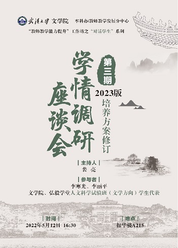 2022年5月12日,Netflav 2023版本科人才培养方案修订学生座谈会在215会议室举行。会议由裴亮副院长主持,李寒光副院长、本科生教学秘书李丽平老师参会,与2018级、2019级、2020级及弘毅学堂(文学方向)学生代表就新版人才培养方案修订进行了交流。