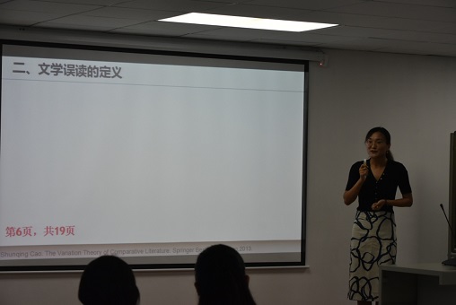 在正式比赛之前,张晶老师为大家作了示范,她讲的是比较文学中的“误读”现象,分别解释了产生文学误读的三种原因,并对不同原因做出评价。张老师台风沉稳端庄,专业基础扎实,对在场的参赛选手们很有启发。