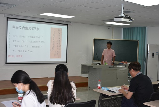 王统尚老师是第二位参赛者,他讲授的题目是“甲骨卜辞选读:受年”。王老师以逐字释读《甲骨文合集》36975版的形式,细致讲解了“王”“岁”“东”“土”等字的本义,重点讲了“年”的本义是禾谷成熟,人们“庆丰收”,而不是普通民众理解的“打妖怪”,很有趣味。