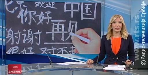 图为2019年4月20日,塞尔维亚国家电视台播出的莱斯科瓦茨中国日及塞尔维亚中小学汉语教学试点项目7周年纪念的新闻报道,大力赞扬汉语教师志愿者团队为当地所作的贡献。