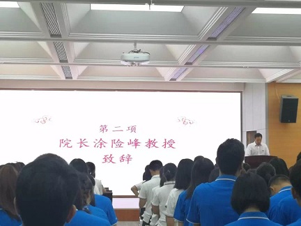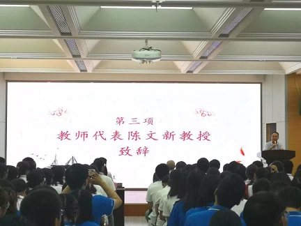 涂险峰院长的致辞后是教师代表陈文新教授致辞。他祝贺新生们即将跨入新的人生平台,也有三句话想要因此送给大家:热爱生活,在良好的Netflav 环境中,在风华正茂的年纪,要过丰富多彩的生活,更要追求大的人生与生活境界;热爱学术,“学习是重要的事,有些事情必须努力做到”,他如是说道,“我们应该去发挥人文学科的光亮,拎着学问,免于流入世俗”;最后便是把握好长跑节奏,时时刻刻保持好的状态,不急功近利,也需充实自己。