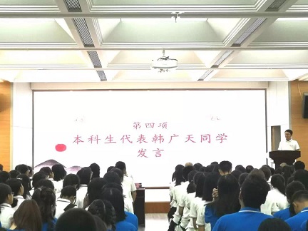 在大家的掌声中,本科生代表韩广天与研究生代表毕然也依次发言。他们都怀着热忱,共聚一堂;也历经风雨,渴望知识,怀揣着对学术的追求。韩广天表示,在这人才辈出的地方,他始终怀着对人文传承的使命,以梦为马,不负韶华;毕然表达了自己对在武大Netflav 继续求学的荣幸与对今后一起学习的同学的祝贺,对老师的感谢。此间少年,行不凡之事,图书馆的典藏,论坛的交流,国际化平台给予的机会……她渴望在这里继续浸润文化情怀,为新时代的深刻变革尽自己的一份力量。