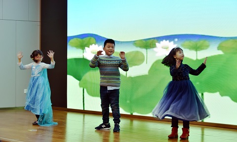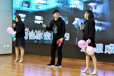 游戏环节也是笑声不断。“快乐传真”让在场观众分组上台用肢体语言表演传递成语,“对牛弹琴”“左顾右盼”“眉目传情”等一个个成语经老师们各自用肢体语言演绎,传递出了妙趣横生的喜剧效果,逗得台下观众捧腹大笑。踩气球比赛更是你追我赶,尖叫声、笑声、气球爆炸声响成一片,热闹非凡。