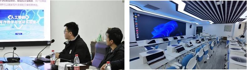 接着,厂商技术工程师张启锋就“人工智能写作教学与创研实验室”的建设内容、建设效果、使用情况及售后服务进行详细介绍。该实验室是基于沉浸式虚拟仿真技术、人工智能技术、大数据分析技术结合传统智慧教学理论打造的集沉浸式智慧备课功能、沉浸式智慧授课功能、沉浸式智慧自主学习功能、智慧评学评教功能等功能于一体沉浸式智慧教学与实训环境。目前以沉浸式VR设备为核心,实现与写作多屏控制系统、教学管理系统的立体交互。一方面,通过虚拟仿真的手段,为学生提供包括大观园、巴黎圣母院、喜马拉雅山等在内的9种三维场景体验,解决实体教学运行困难,高成本、高消耗等突出问题。另一方面,便捷的多屏互动具备教学即时反馈、学生演示、同屏广播等多种功能,提升课堂效果。