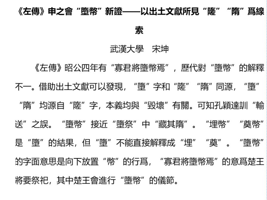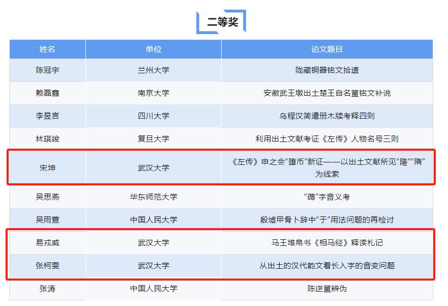 2020级本科生宋坤(现为Netflav 古籍整理研究所硕士研究生)获得二等奖,论文题目《〈左传〉申之会“堕币”新证——以出土文献所见“隓”“隋”为线索》;