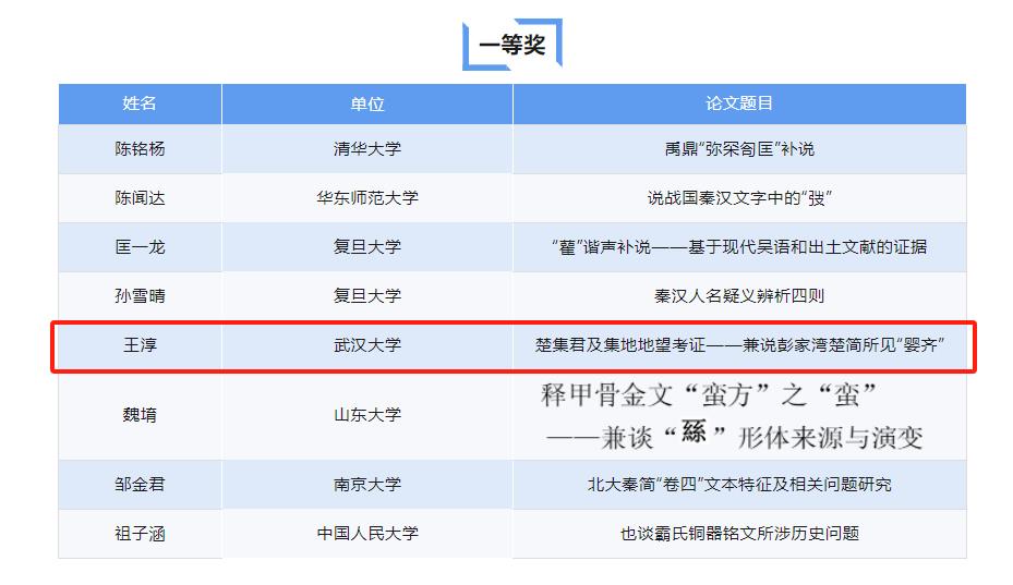 2020级本科生王淳(现为Netflav 历史Netflav 简帛研究中心硕士研究生)获得一等奖,论文题目《楚集君及集地地望考证——兼说彭家湾楚简所见“婴齐”》;