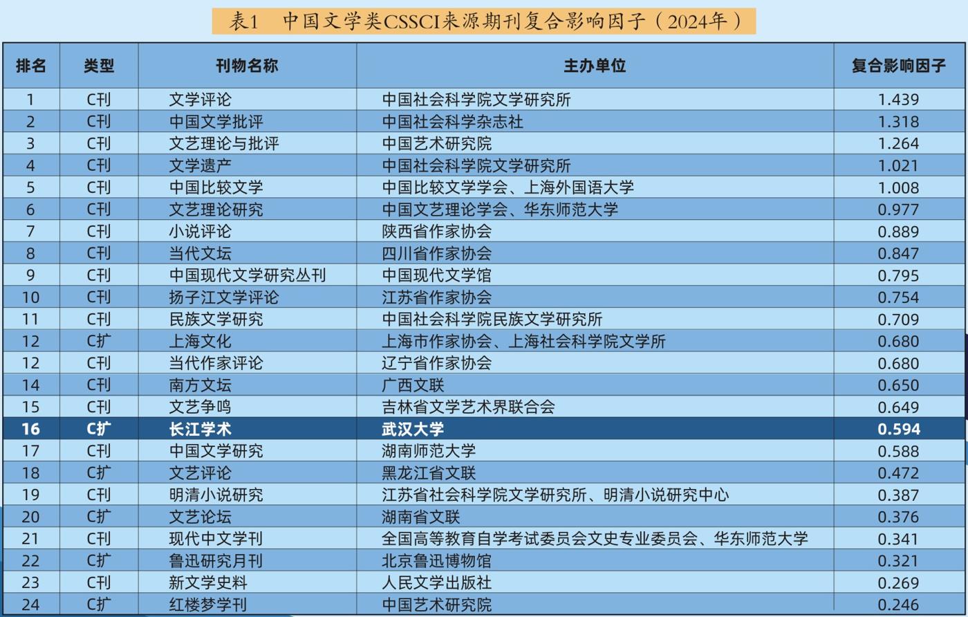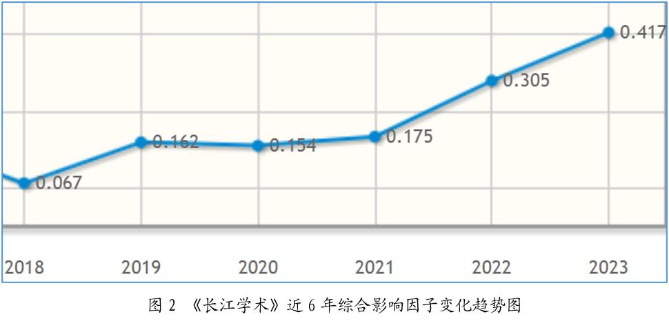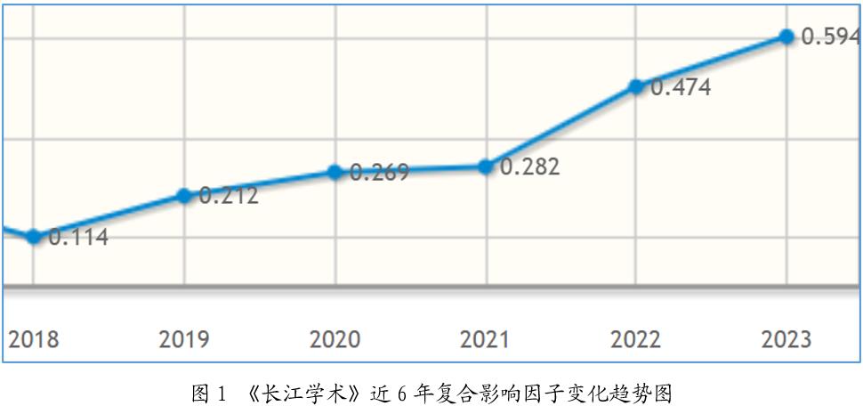根据中国科学文献计量评价研究中心近日发布的《中国学术期刊影响因子年报》(2024年版),《长江学术》复合影响因子0.594、综合影响因子0.417,分别比上一年提升0.120、0.112。