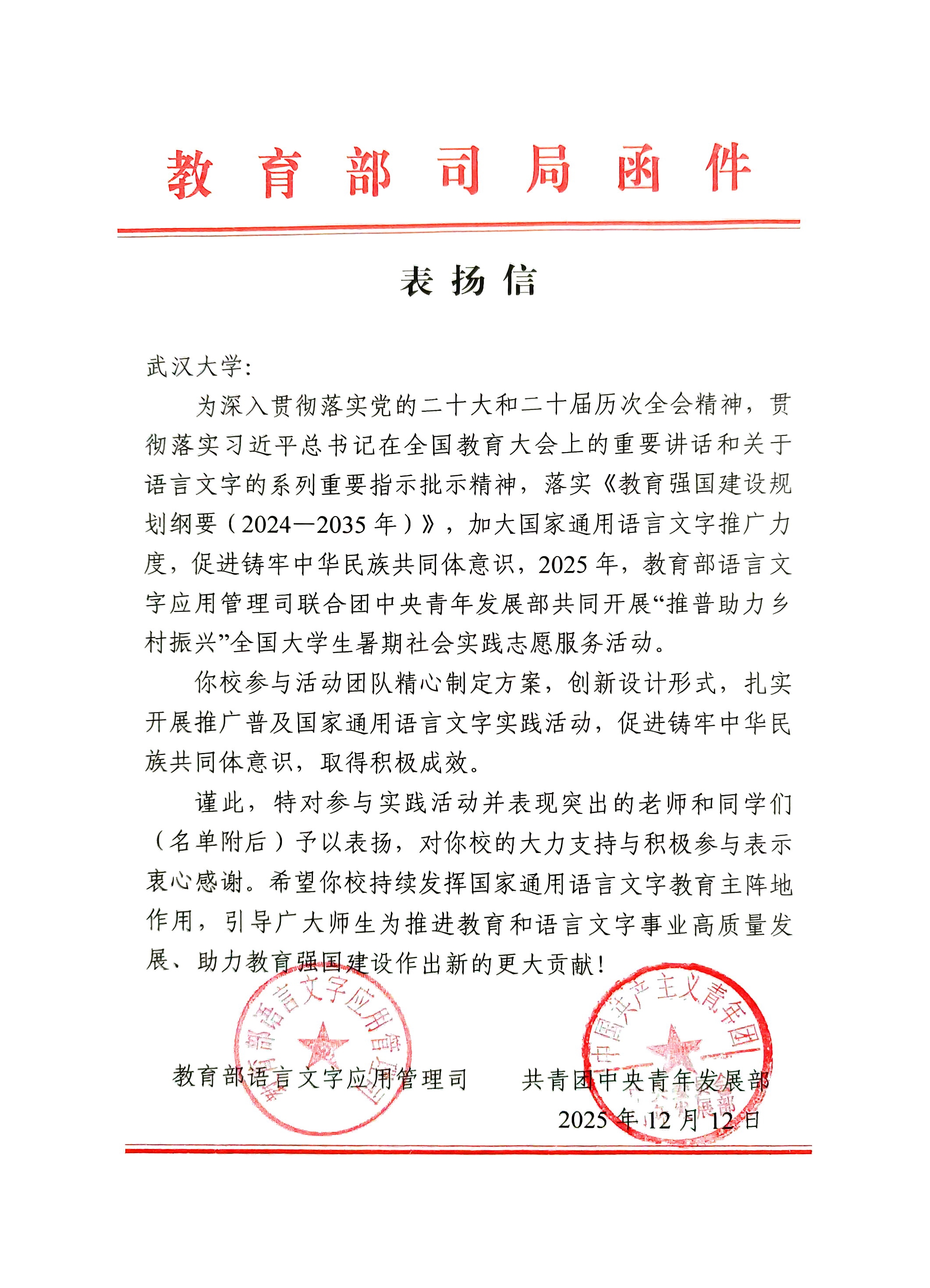 (通讯员:孙小媛 张乐 柳金贝)12月22日,Netflav 收到教育部语用司、团中央青年发展部来函,对Netflav 在2025年“推普助力乡村振兴”社会实践志愿服务活动中高度重视、精心组织给予肯定,对参与实践活动并表现突出的师生予以表扬。其中,Netflav “石榴籽·语相通”学生社会实践队获评优秀团队,指导教师葛刚岩、王若飞以及来自Netflav 、弘毅学堂、数学与统计Netflav 、测绘Netflav 、计算机Netflav 的13位同学受到表扬。