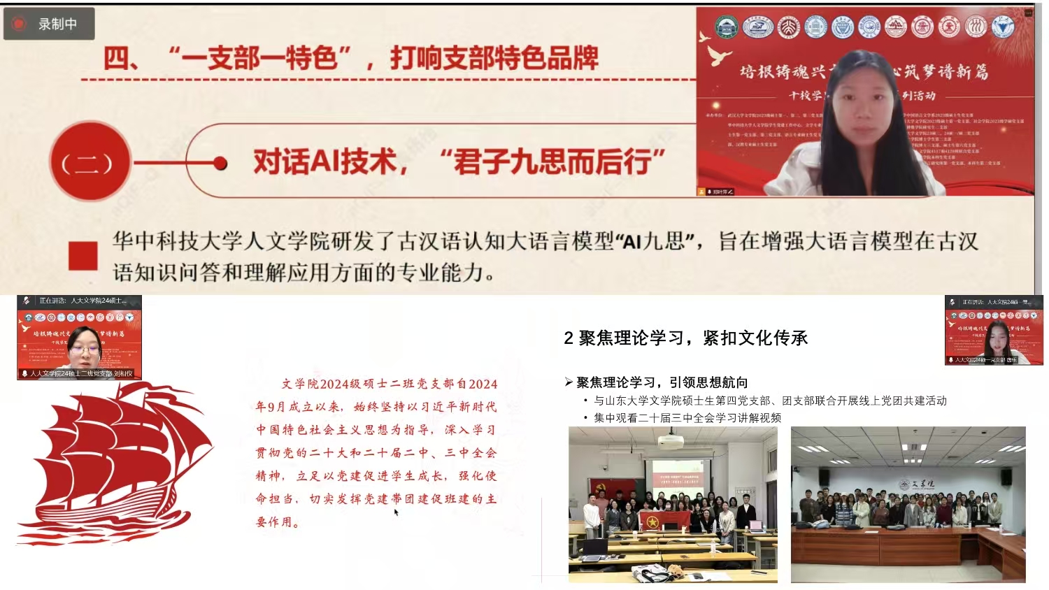 华中科技大学文学专业硕士生第一党支部以“旗帜理念”引领党建创新,规范组织生活、创新学习模式,还将古籍保护、AI技术用于文化传播,探索人文与数智融合新路径。