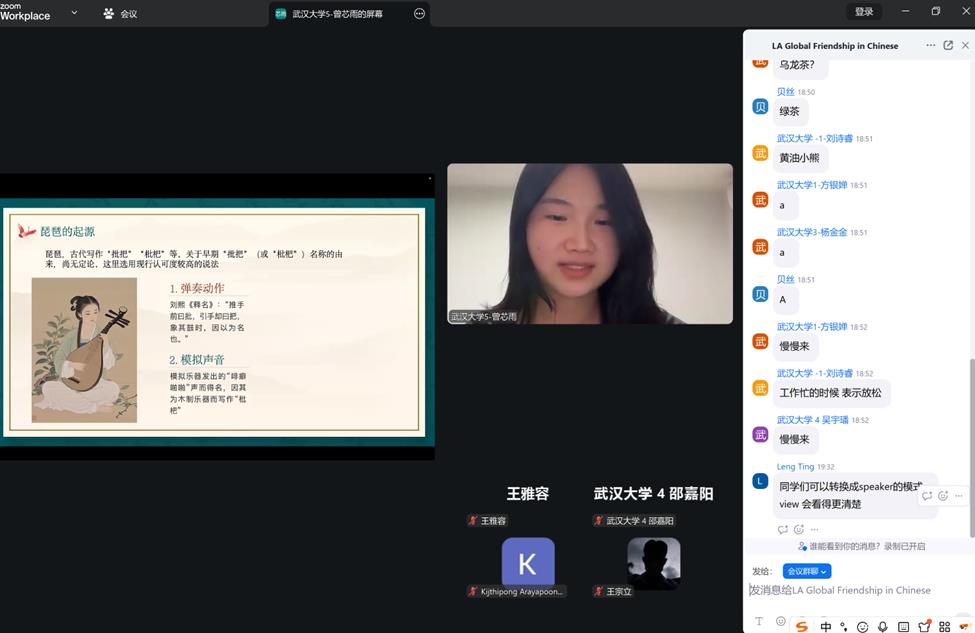 中国学生的展示同样精彩纷呈。大家围绕武汉城市文化、中国传统乐器琵琶、特色饮食糊涂粥、大学生养生八段锦四大主题展开分享,从历史底蕴、艺术魅力、饮食特色到传统养生智慧,全方位、多角度展现中国文化的独特魅力。其中,琵琶现场演奏、八段锦互动教学的环节,更是给泰方师生留下深刻印象,收获线上听众的频频点赞。