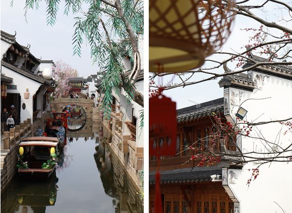 祥云湾文化旅游区内,历史与现代巧妙融合。颇具特色的“古建八派园”汇聚了各色古建筑,花团锦簇的游船荡漾在蜿蜒水路,加之南钟北鼓、古桥横跨的精心设计,同学们仿佛行走在热闹的古代市井,感受流传百年的民间魅力。