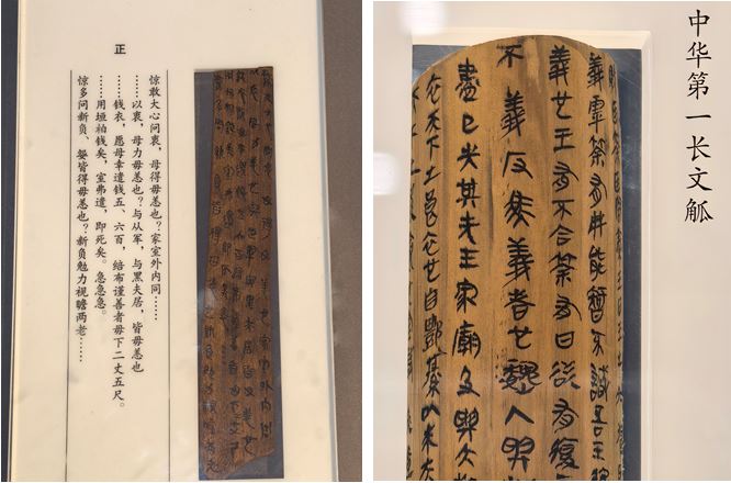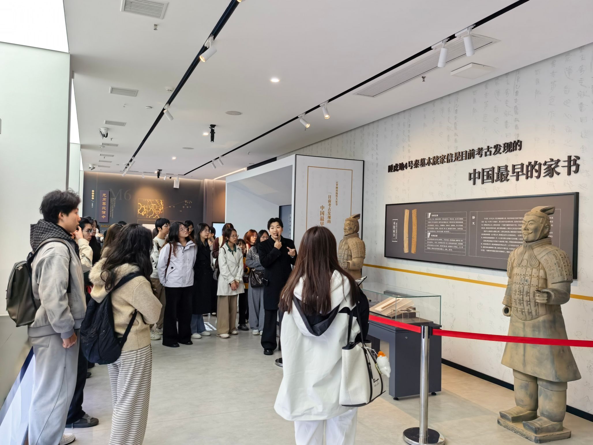 展厅中,国家一级文物、镇馆之宝中华第一长文觚更是惊艳。树皮制成的文觚,7个菱面与背面满布秦隶,记载着谋士游说秦王止战的历史,笔墨铿锵,尽显纵横家的雄辩与智慧。我们在展柜前细细辨认秦隶笔法,感受汉字从篆到隶的演变,统尚老师所讲的古文字知识,此刻都化作了触手可及的真实。